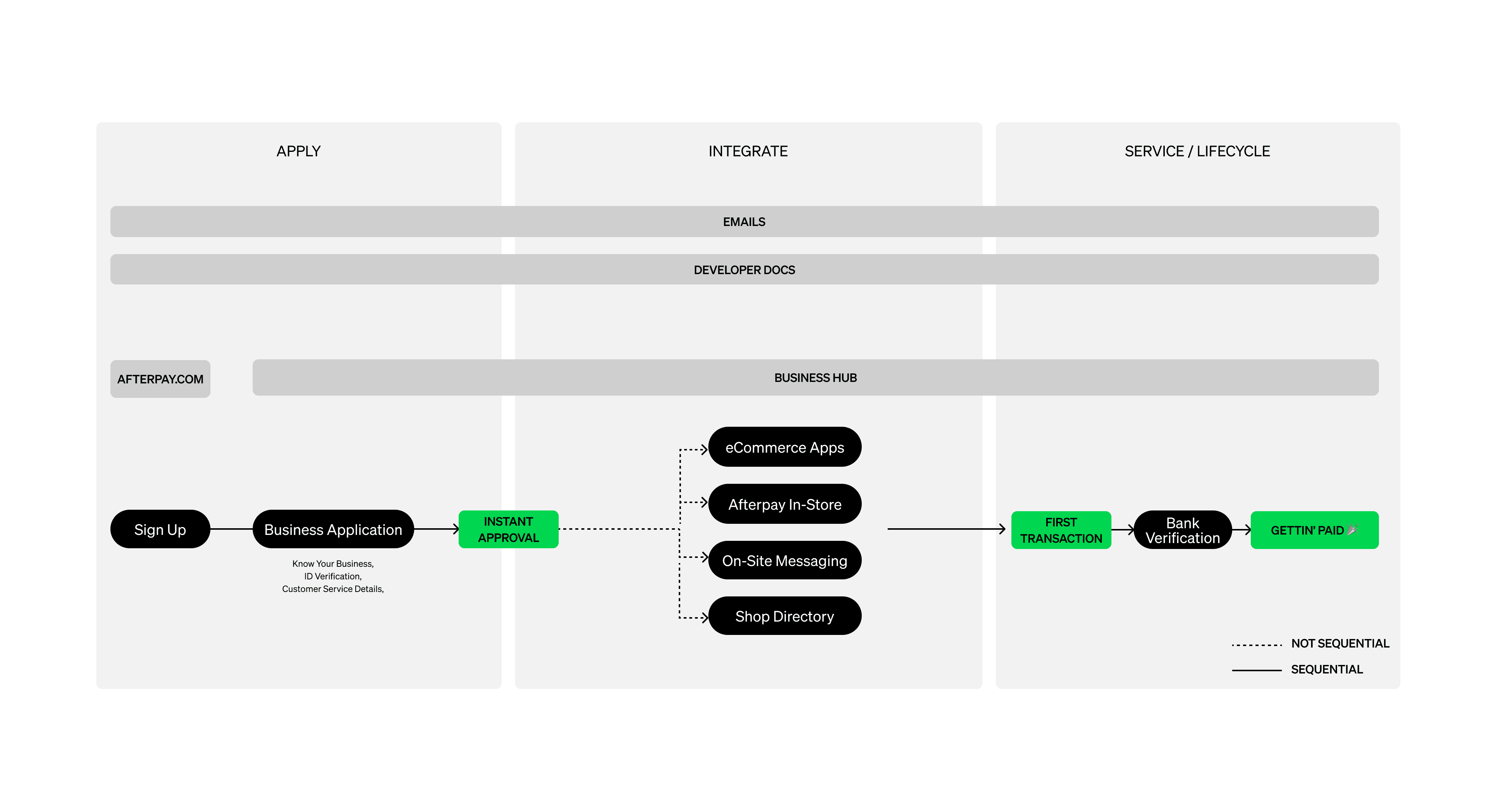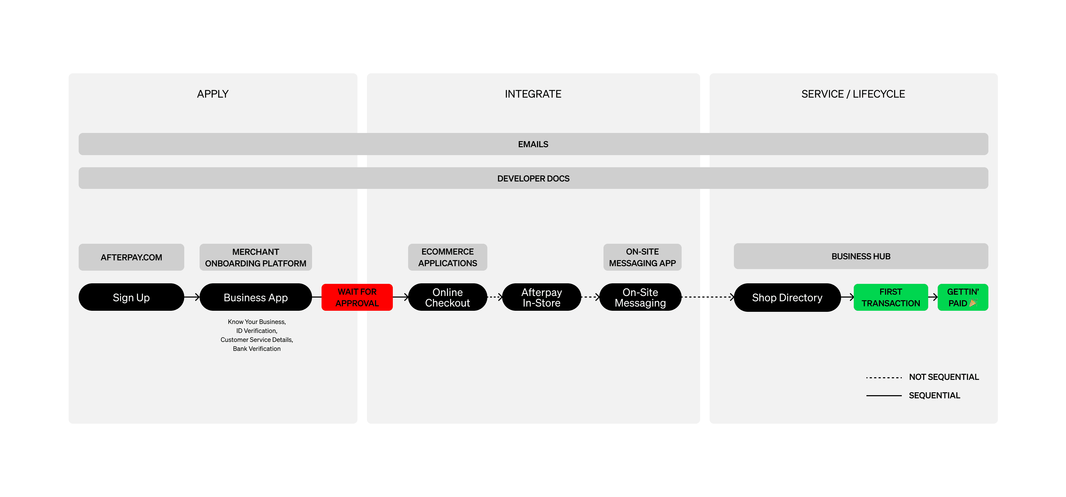 Signing up as an Afterpay merchant meant navigating three separate platforms with three different login credentials. The form was full of questions that weren't actually required, nearly half had nothing to do with KYB or compliance. And until everything was approved by our internal legal teams, merchants couldn't access the Business Hub, set up payment integrations, or do anything to move the needle in their business.