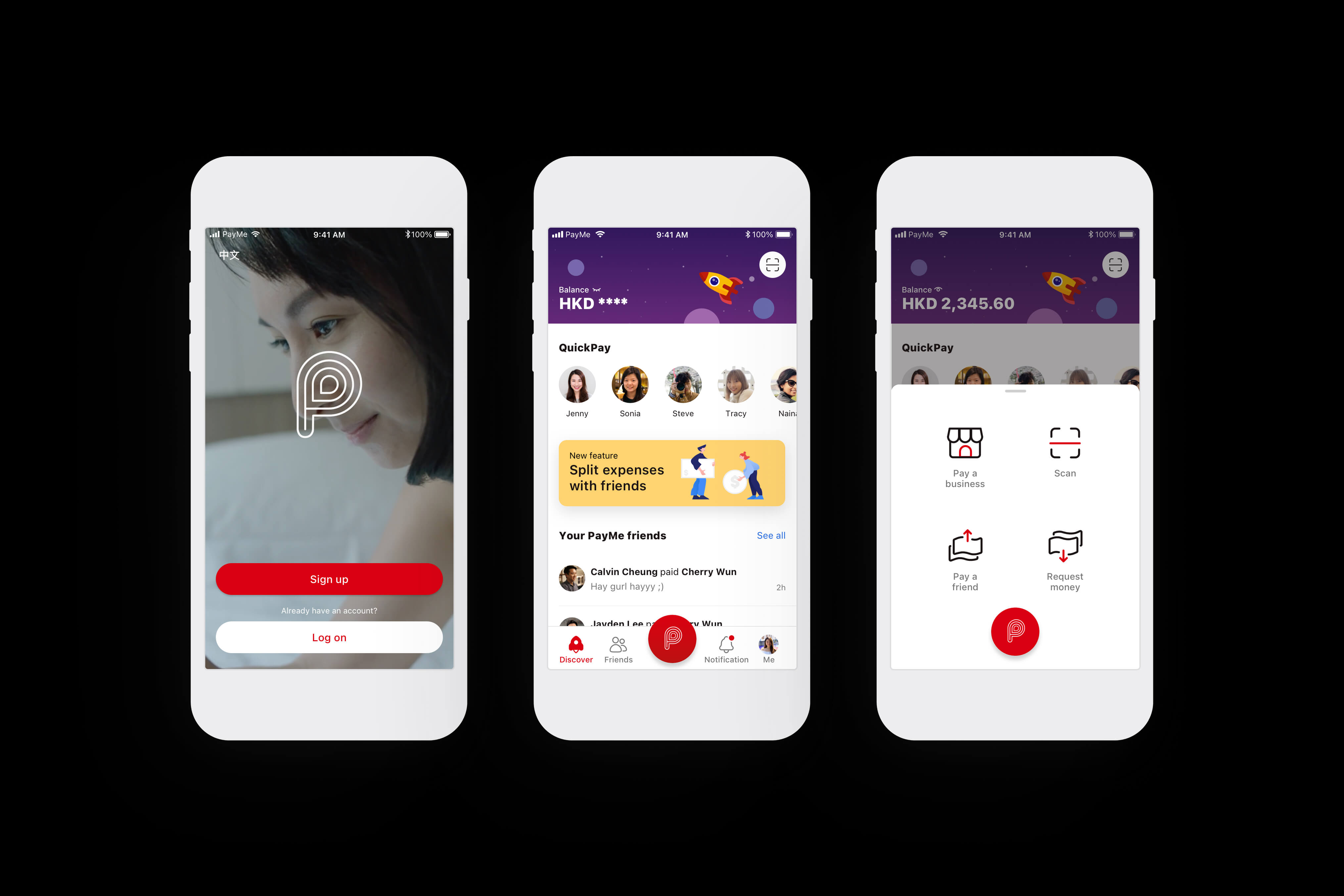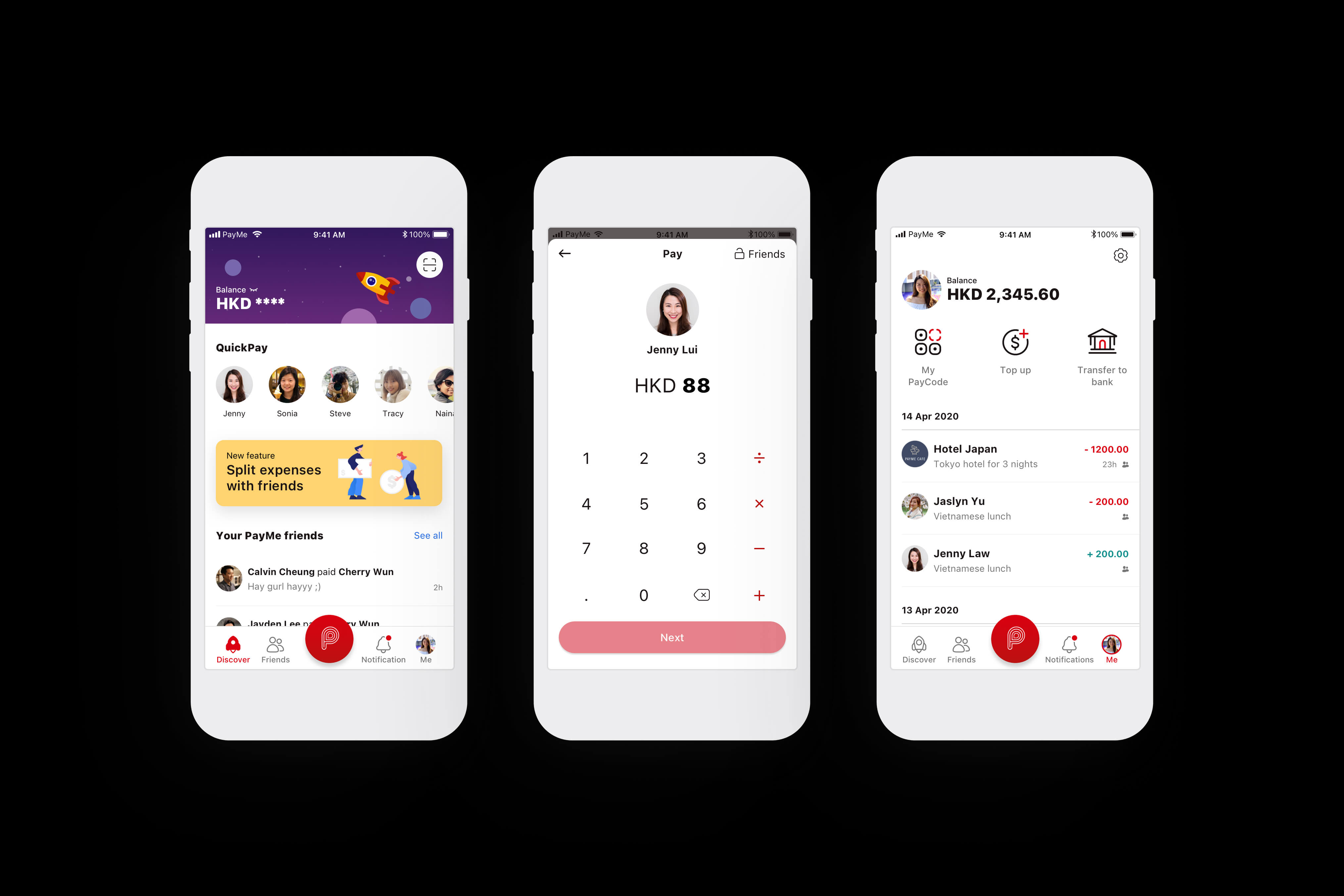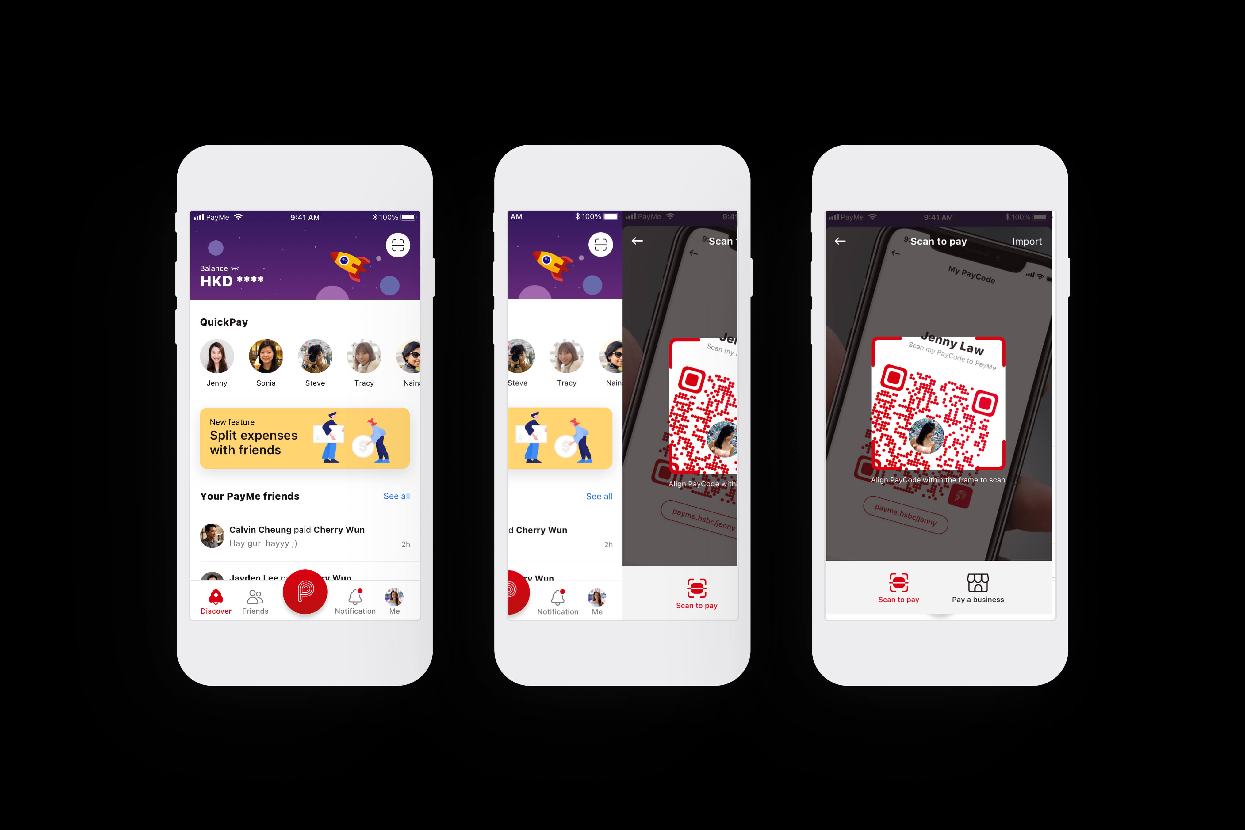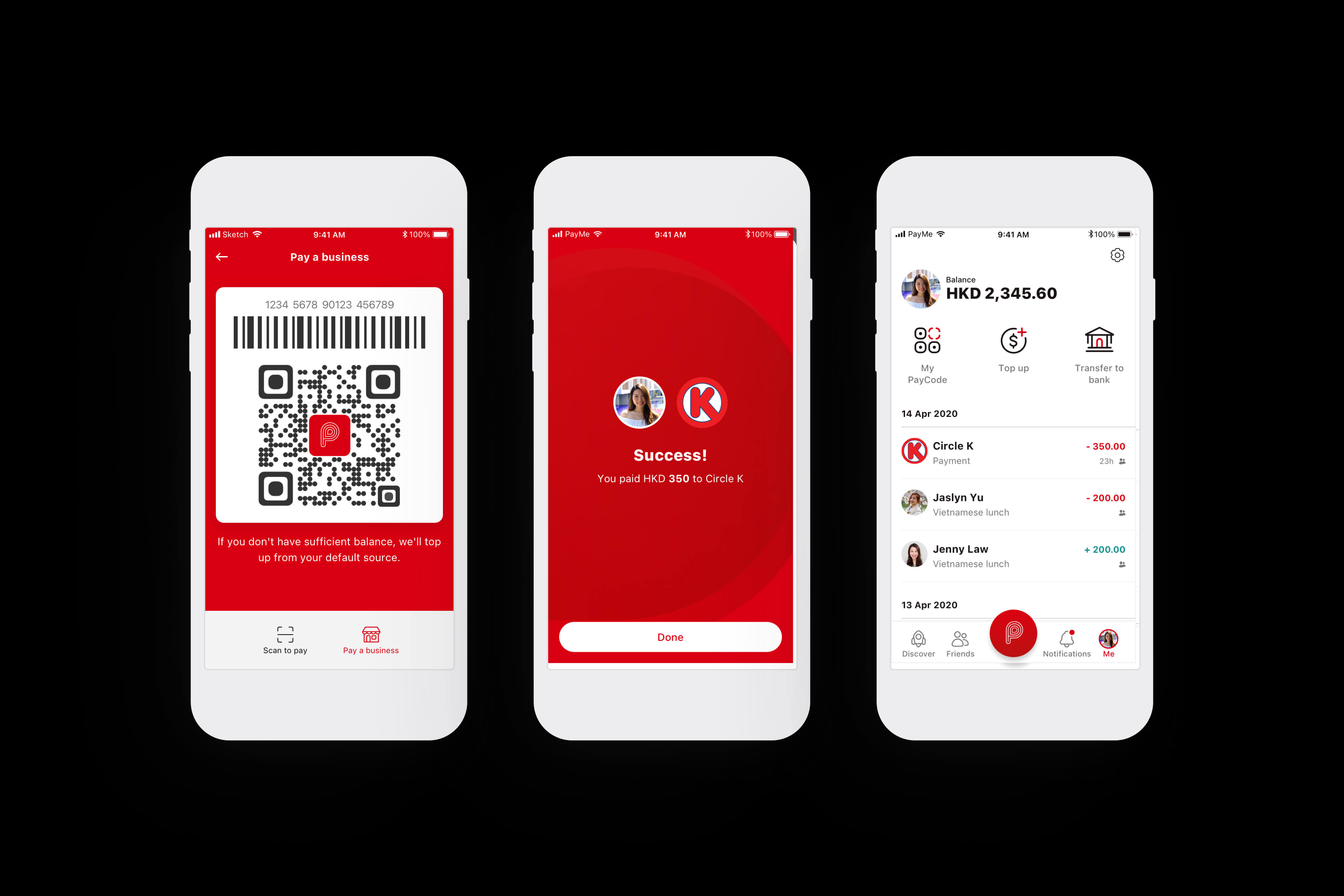 Key PayMe screens: Discover, Pay, My Transactions