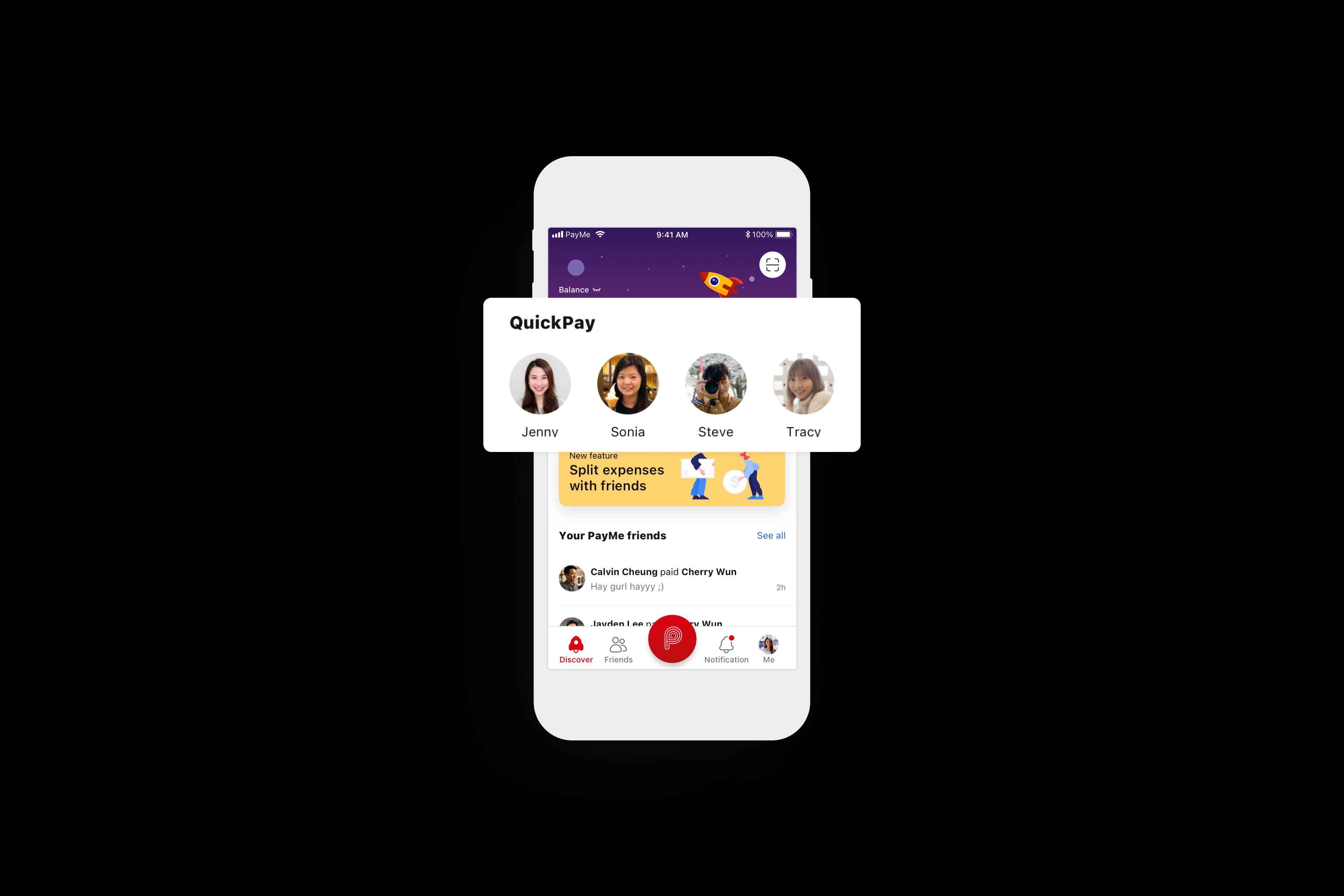 Swipe from the Discover tab to seamlessly pay friends